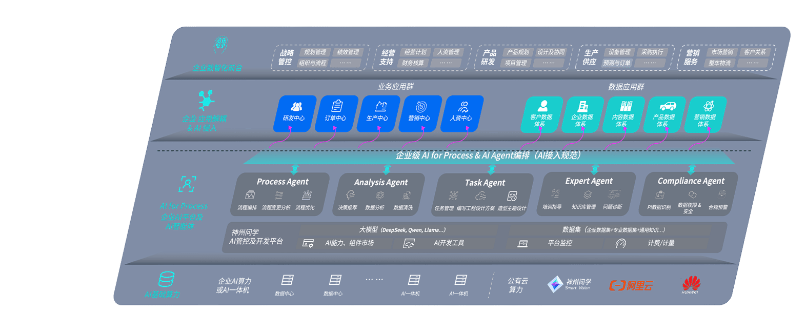 端到端的一站式AI工作空间深度融合了从企业战略规划到日常经营的全流程业务板块,,定向解决车企内部领域多、、、部门多、、、、链条长、、、、场景碎片化等难题,,支持车企快速构建以AI为核心的生产力写作体系,,实现任务执行与AI能力的无缝集成与交互